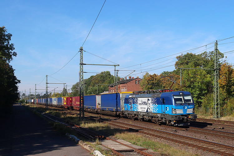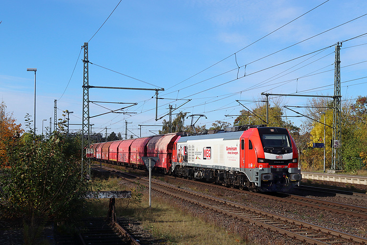 Am 19.10.2025 kam MEG 159 217 mit dem leeren Gipszug Stadtoldendorf - Böhlen. |