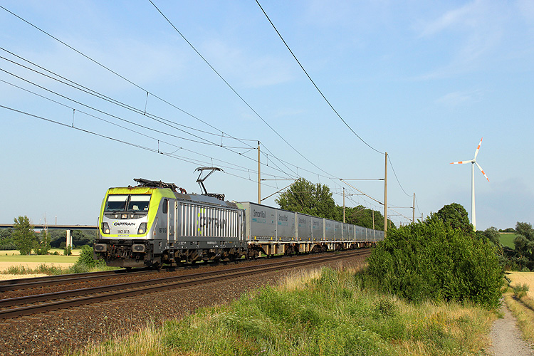 Wie fast jeden Sonntag war am 30.06.2019 Captrain 187 013 mit dem Smartrail KLV Dresden - Emden früh dran und konnte so im besten Licht aufgenommen werden. |