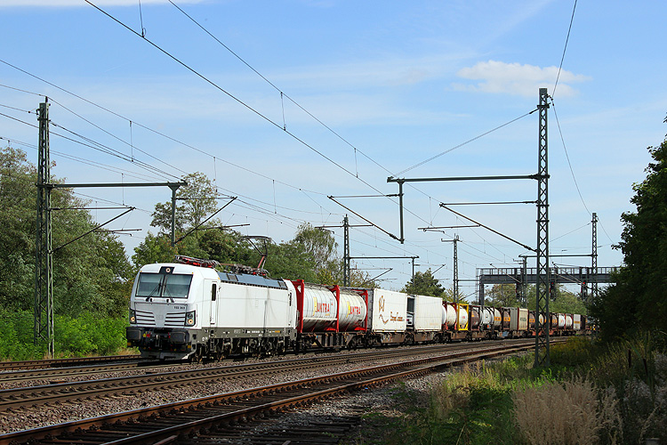 Die Röhrenzüge von Mülheim nach Tschechien sind in 2019 Aufgabe von VTG-Rail. Am 02.09.2019 bekam ich in Ovelgünne 193 825 mit einem solchem Zug vor die Linse. |