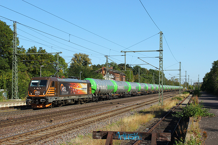 Am 22.09.2019 kam HSL 187 538 mit dem Ethanol-Kesselzug DGS 95322 Pirna - Hannover Misburg. |