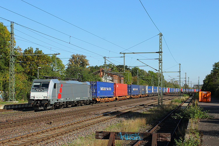 Am 07.10.2019 hing die silberne LTE 186 355 vor dem Poznan-Shuttle DGS 41350 Poznan - Rotterdam. |