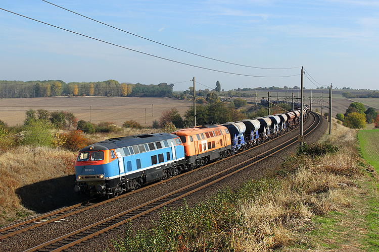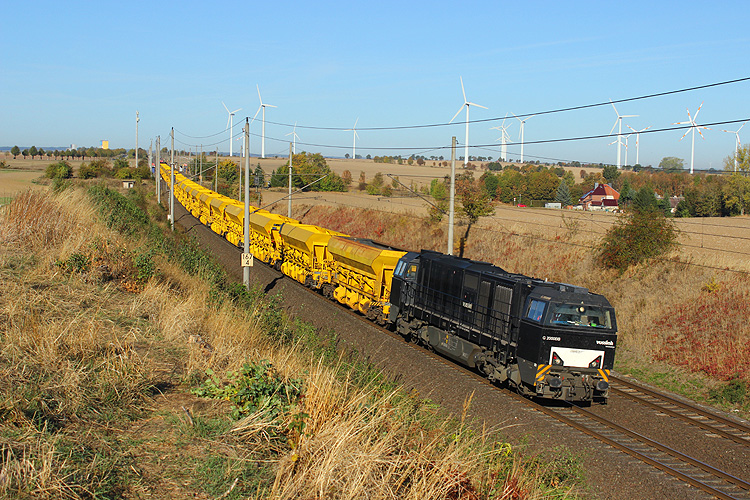 Am 05.10.2018 war genau das richtige Wetter für Ovelgünne - sonnig, aber nicht zu warm. 272 407 von Strabag war mit einem leeren Schotterzug in Richtung Magdeburg unterwegs. |