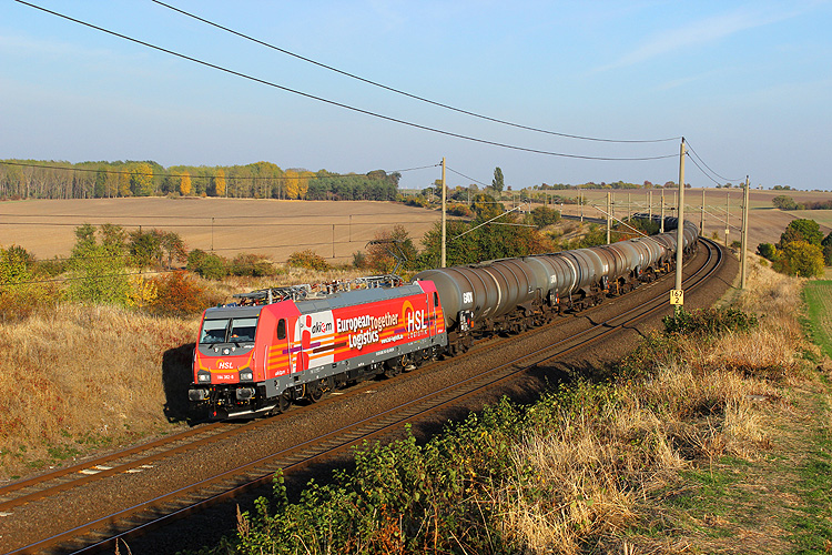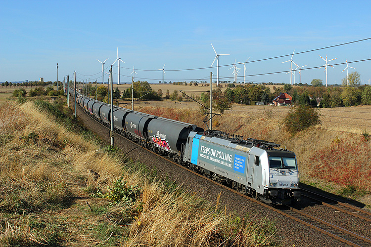 HSL 186 436 "Keeps on Rolling" fuhr mit einem Getreidezug in die gleiche Richtung. |