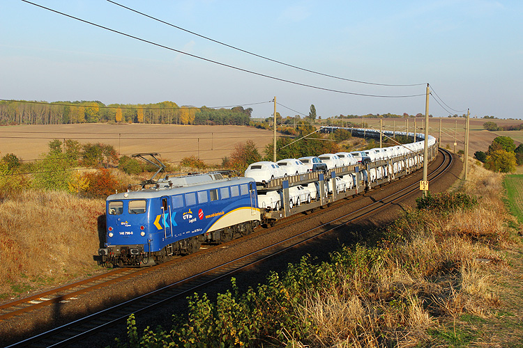 Ovelgünne am 10.10.2018: MEG 143 257 kam mit dem leeren Porschezug Emden - Leipzig. |