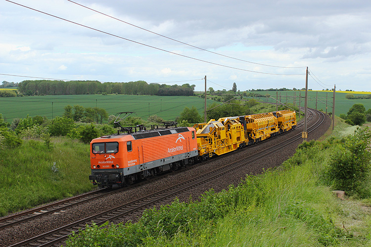 Am 24.05.2017 war Arcelor-Mittal 143 001 mit einem Bauzug von Guben nach Neubeckum unterwegs, aufgenommen bei Ovelgünne. |