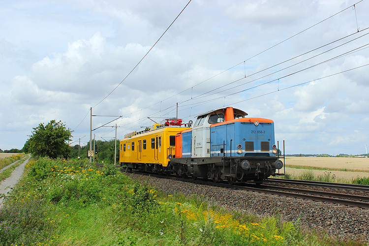 Am 28.07.2017 fuhr Locon 212 058 mit dem Oberleitungs-Revisions-Triebwagen 708 325 über die KBS 310 ostwärts. |