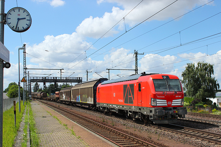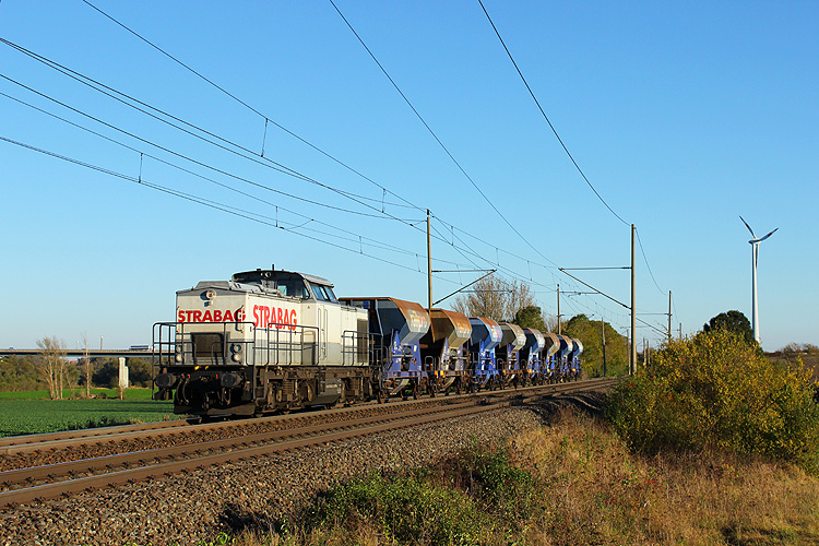 Strabag 203 841 war mit einem Schotterzug von Oranienburg nach Hamburg unterwegs. |