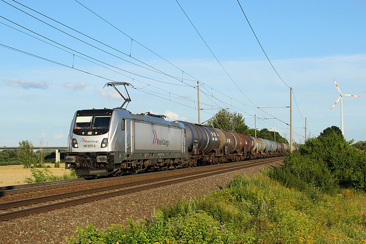 RHC 187 077 fuhr mit einem Kesselzug westwärts. |