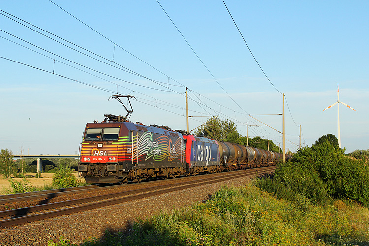 Ebenfalls mit einem Kesselzug folgte die bunte 185 602 der HSL, die auch noch Schwesterlok 482 045 im Schlepp hatte. |