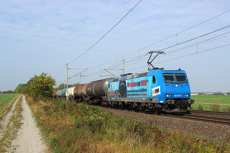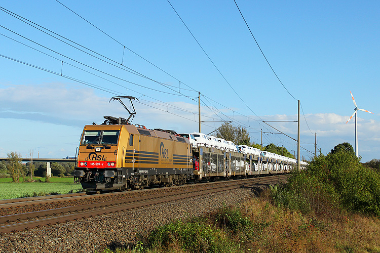 Mit einem BLG-Autozug war "Goldi" 185 597 der HSL in Richtung Westen unterwegs. |