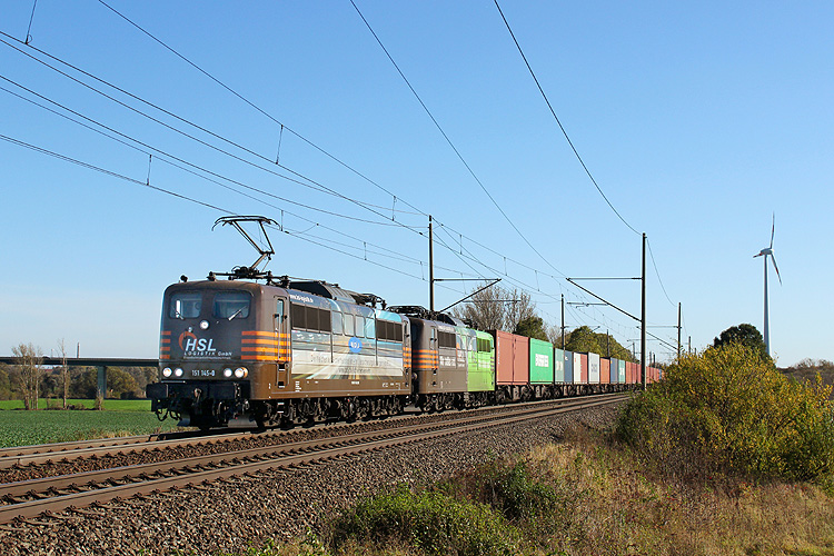 Am 15.10.2017 kam HSL 151 145 mit 151 138 und dem Containerzug Hof - Hamburg durch Niederndodeleben. |