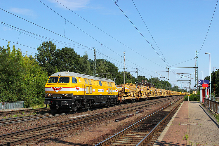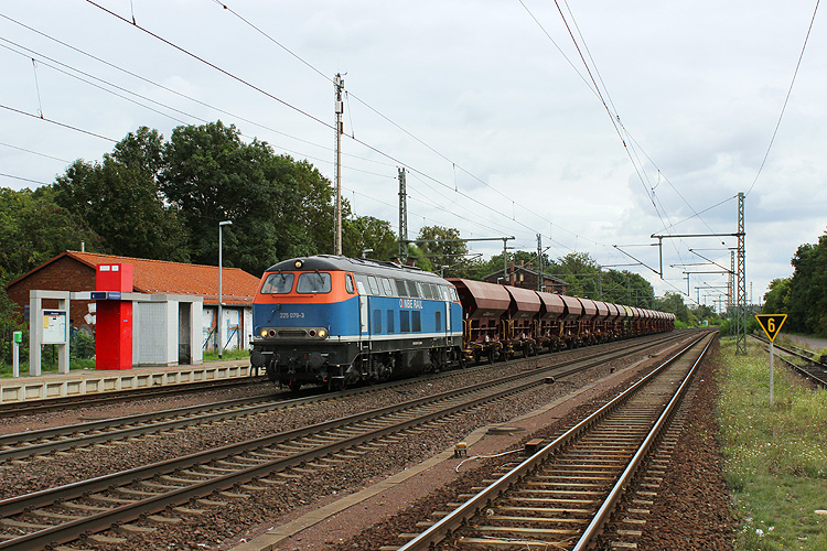 Später fuhr die nun für die Lappwaldbahn fahrende ehemalige NBE 225 079 mit einem Schotterzug westwärts. |