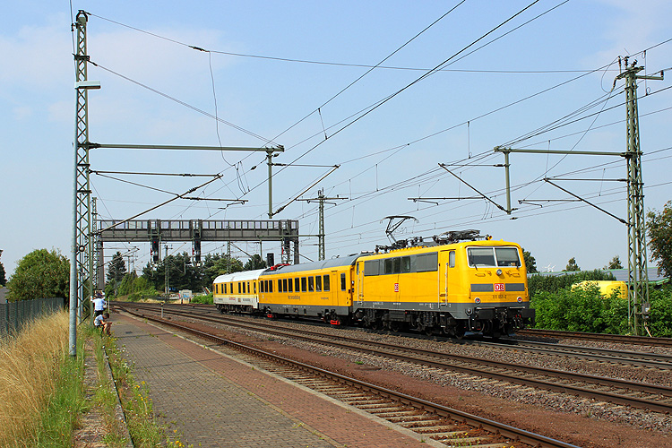 Am 14.08.2015 fuhr die gelbe 111 059 mit einem Meßzug in Richtung Braunschweig durch Niederndodeleben. |