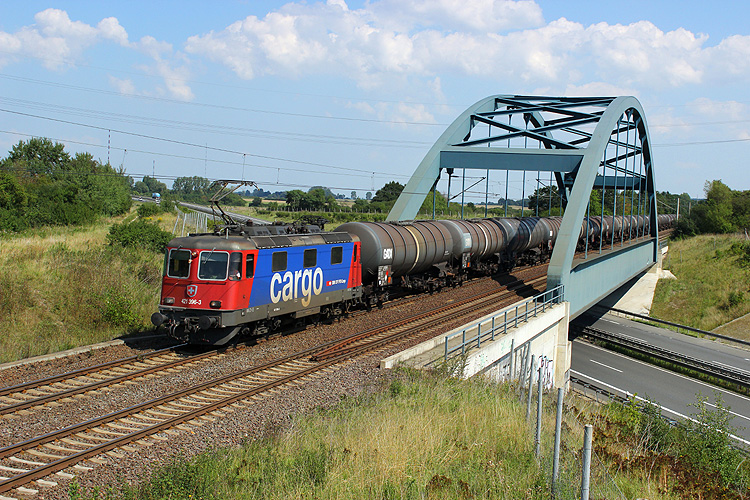 Am 21.08.2015 war ich für 3 Stunden an der Brücke der Strecke Magdeburg - Braunschweig über die A 39 bei Schandelah. Unter anderem kam die für die HSL fahrende 421 396 von SBB-Cargo mit einem Kesselzug in Richtung Westen. |