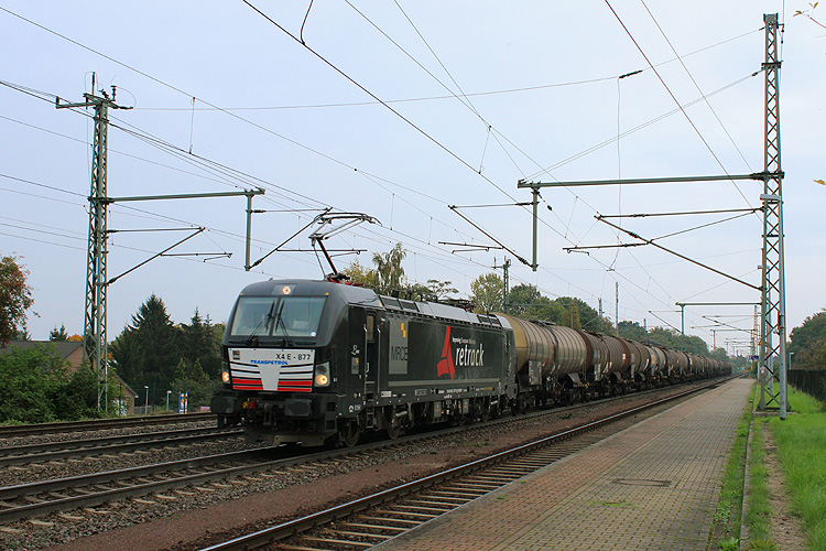 Am 18.10.2015 war der "Retrack"-Vectron 193 877 von Transpetrol mit einem Kesselzug in Richtung Westen zu sehen. |