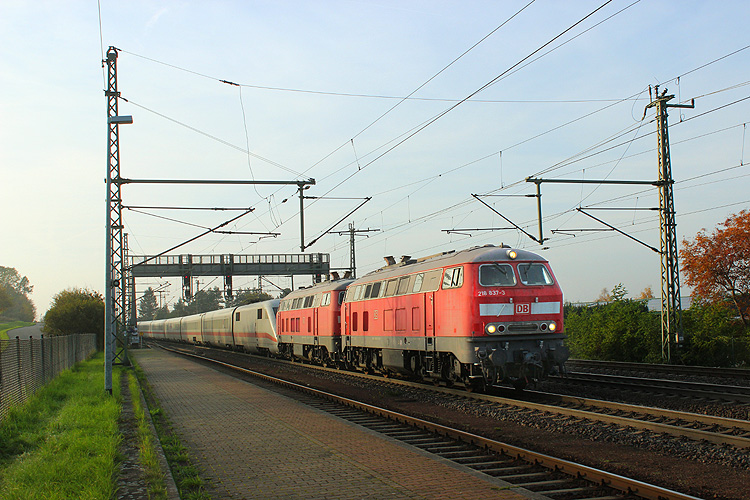 Später schleppte 218 837 und eine Schwesterlok den defekten 402 022 zu seinem Heimatwerk Berlin-Rummelsburg ab, 31.10.2015. |