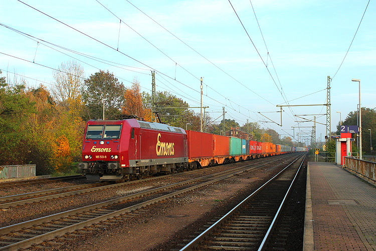 Wie jeden Samstag fuhr der Emons-Containerzug nach Bremerhaven durch, dieses Mal mit 185 513, 31.10.2015. |
