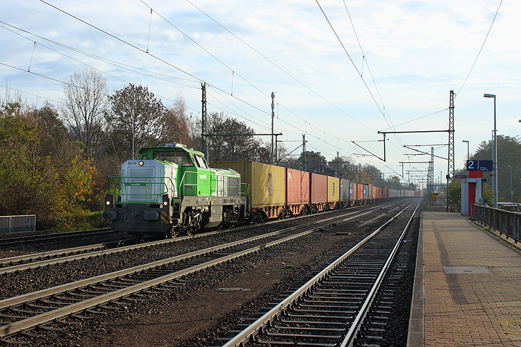 Der Rangier-Bolide DE 18 von Vossloh absolvierte Testeinsätze für Emons, als er mir am 05.11.2015 mit einem Containerzug nach Hamburg vor die Linse fuhr. |