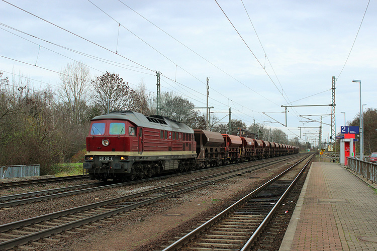 Am 20.11.2015 durchfuhr 231 012 der WFL mit einem Schotterzug in Richtung Westen den Bahnhof Niederndodeleben. |