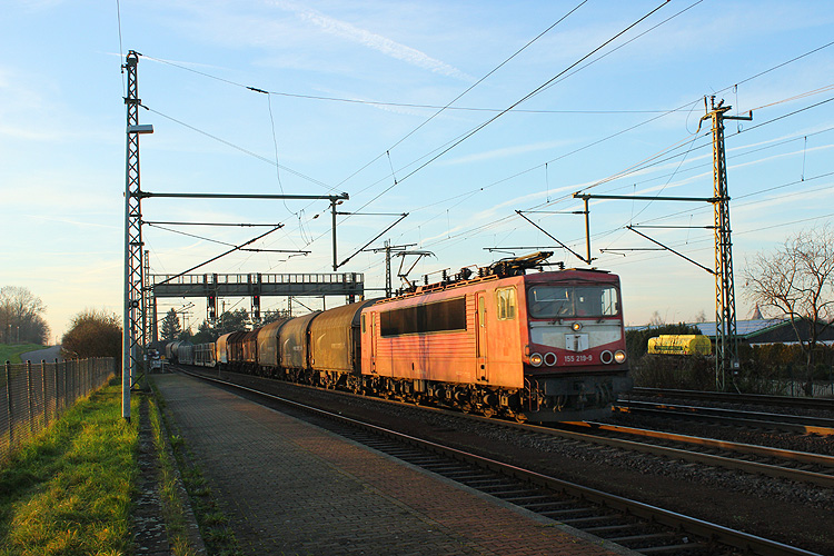 Am Nachmittag des Tages konnte ich noch die letzte aktive orientrote 155 von DB-Schenker, 155 219, mit einem gemischten Güterzug in Richtung Magdeburg aufnehmen, 08.12.2015. |