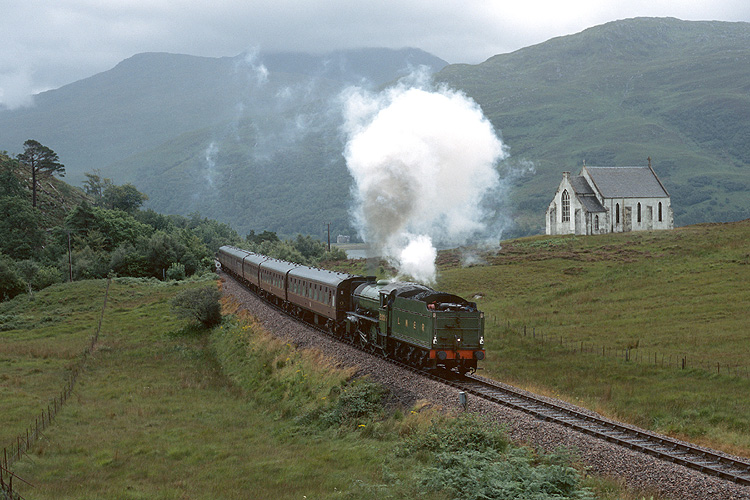 Als nächstes stand ein Besuch der Strecke Fort William - Maillaig in Schottland auf dem Programm. Im Einsatz vor dem täglichen Dampfzugpaar war LNER 2005, hier passiert sie den Viadukt am Loch nan Uamh in Fahrtrichtung Mallaig. |