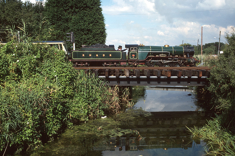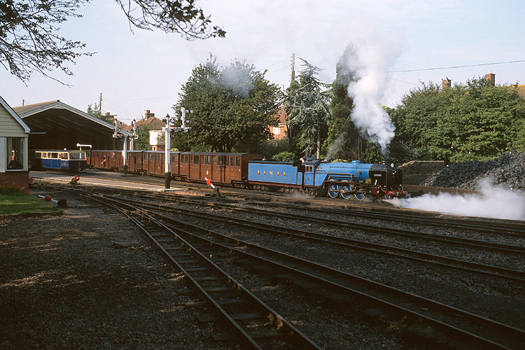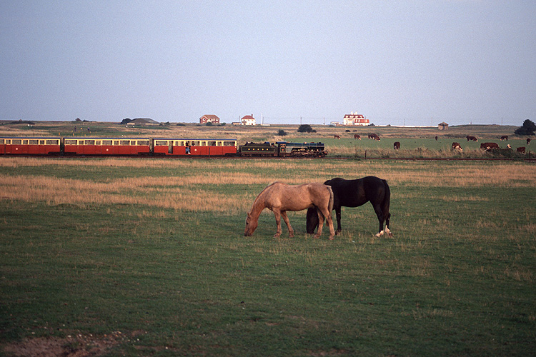 Bei meiner zweiten Hobbyreise nach Großbritannien im August 1996 begann ich mit der Touristenbahn Romney, Hythe and Dymchurch Railway. Diese 15 Zoll Miniaturbahn bietet als zweigleisige Hauptbahn dichten Zugbetrieb, hier die "Southern Maid" mit Zug nach Hythe bei Dymchurch. |