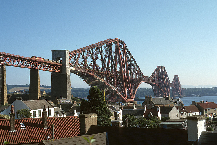 In den nächsten Tagen stand die Eisenbahn einmal nicht im Mittelpunkt, schließlich wollte ich auch andere Sehenswürdigkeiten besuchen. Besonders beeindruckend fand ich die Eisenbahnbrücke über den Firth of Forth, einem Meeresarm nördlich von Edinburgh. Über die Brücke verläuft die Haupstrecke nach Perth, wohin der oben zu sehende Güterzug unterwegs ist. |
