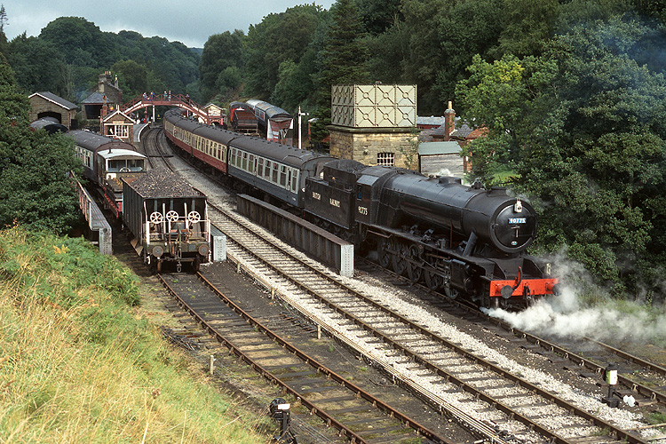 Dann ging es wieder zurück zur North Yorkshire Moore Railway, Kriegslok 90775 verläßt mit einem Zug nach Pickering den Bahnhof Goathland. |