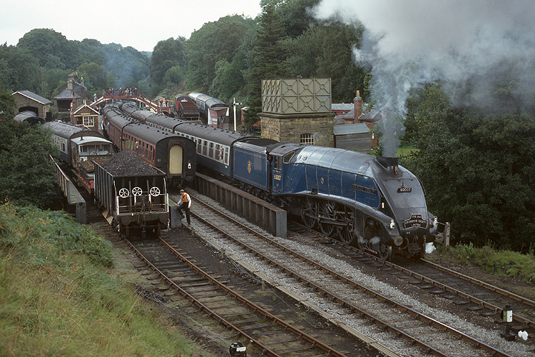 Das war der Grund, warum ich noch einmal zu dieser Bahn zurückkehrte, die A4 60007 "Sir Nigel Gresley" kam zum Einsatz. Nach der Kreuzung mit einem Gegenzug fährt sie aus Goathland aus. |