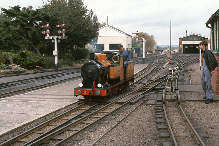"Samson" fährt mit Zug nach Dungeness aus New Romney aus. |