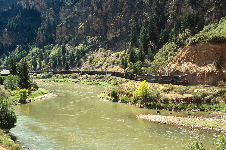 Auf Weiterfahrt in Richtung Westen kamen wir auch durch den Glenwood Canyon, wo diese Aufnahme eines ebenfalls westwärts fahrenden leeren Erzzuges der Southern Pazific Railroad entstand. |