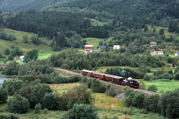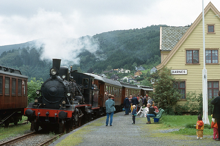 In meinem Norwegen-Urlaub 1998 schaute ich mal bei der Gamle Vossebanen, einem durch eine Neubaustrecke nicht mehr benötigten Teilstück der Strecke Bergen - Voss vorbei. Die heute als Museumsbahn betriebene Strecke führt von Midtun nach Garnes. Im Einsatz war die NSB 255, Baujahr 1913, hier abfahrbereit mit Zug nach Midtun in Garnes. |