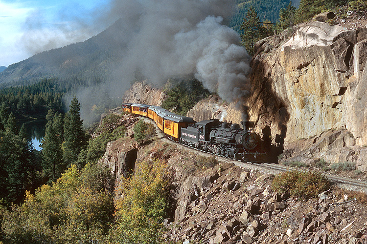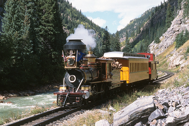 Nächste Station war die Durango and Silverton Railroad. Auch diese 73 km lange Schmalspurbahn gehörte einst zur Denver & Rio Grande Western und diente vor allem dem Abtransport von Silbererz. Die heute als Museumsbahn betriebene Strecke führt entlang des Animas River bis in das 2800 Meter Höhe gelegene Silverton. Hier hat sich die 482 mit ihrem Zug auf die Talfahrt nach Durango gemacht. |