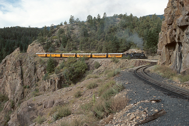 Hinter Rockwood biegt die Strecke durch einen Felsdurchbruch in den Canyon des Animas River ein. In den engen Kurven dort wird nur sehr langsam gefahren, hier die 482 mit dem zweiten Zug des Tages nach Silverton. |
