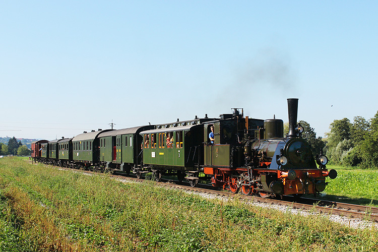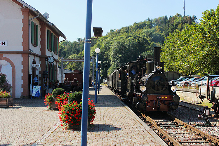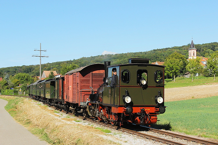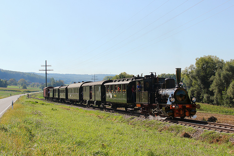 Der Sonntag, 15.09.2019, war für einen Ausflug an die Kandertalbahn reserviert. Lok 90 war im Einsatz, hier mit dem ersten Zug auf der Rückfahrt nach Kandern kurz vor Wittlingen. |