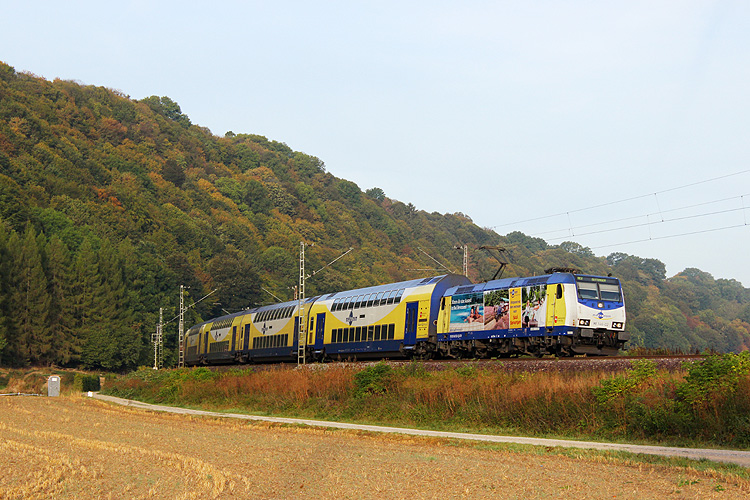 Am 20.09.2019 konnte ich auf der Heimfahrt aus dem Schweiz-Urlaub noch einen Tag an der Nord-Süd-Strecke nahe der Leinebrücke Freden verbringen. Die Metronom- Werbelok 146 502 "Bad Bevensen" kam mit dem RE 82807 Hannover - Göttingen. |