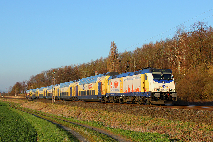 Die für "cambio-Car Sharing" werbende 146 517 war mehrfach zu sehen, hier mit einem Metronom von Uelzen nach Göttingen. |
