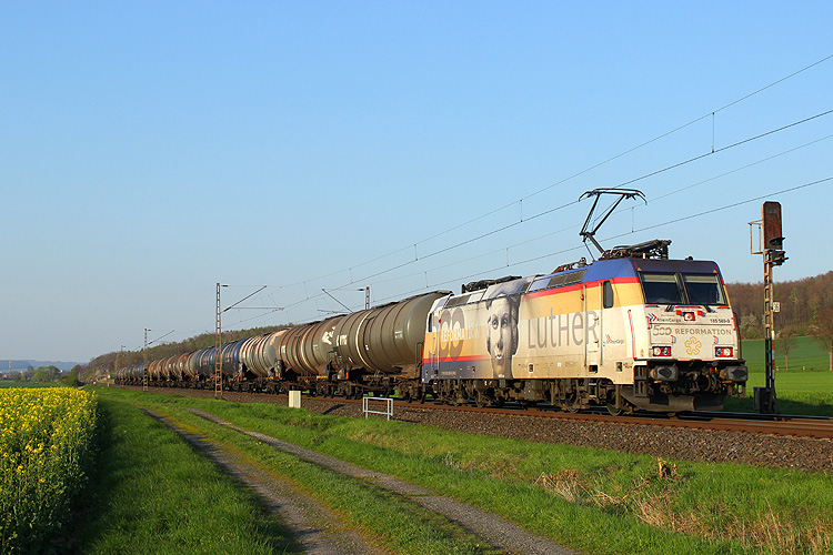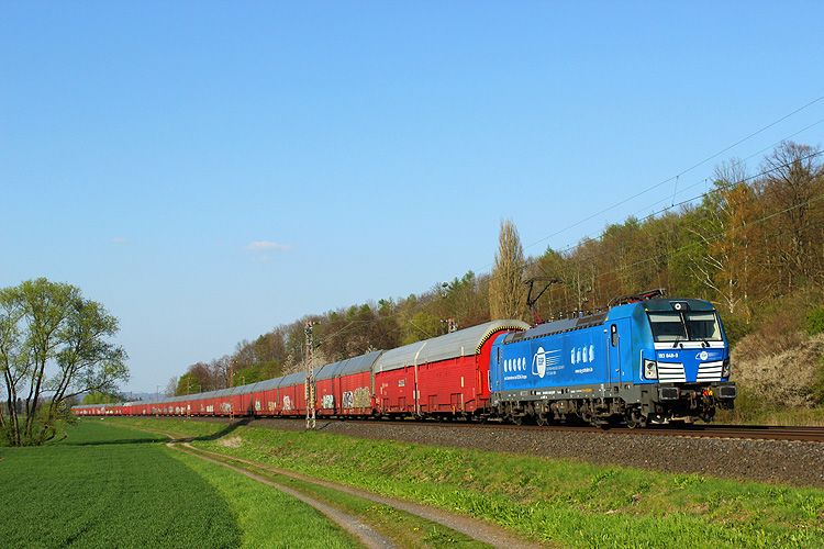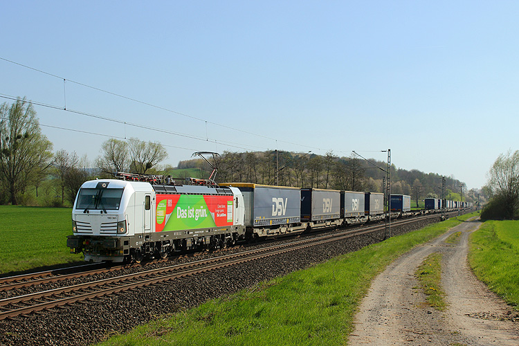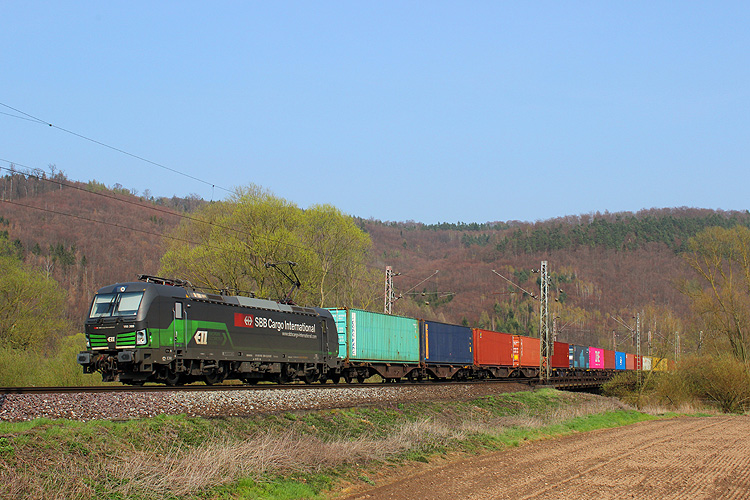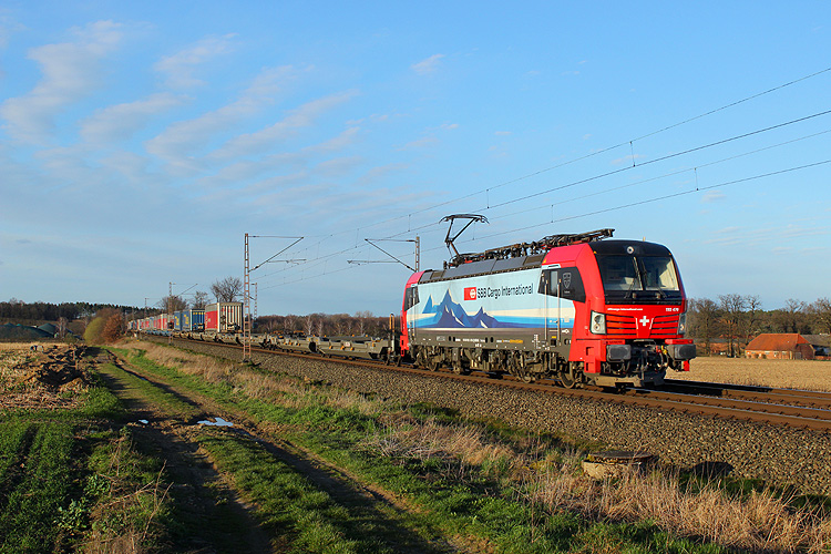Am Nachmittag probierte ich mal eine neue Fotostelle aus, es ging an die Leinebrücke bei Freden. Dort konnte ich unter anderem SBB-Cargo 193 209 aufnehmen, die mit einem Containerzug nach Hamburg fuhr. |