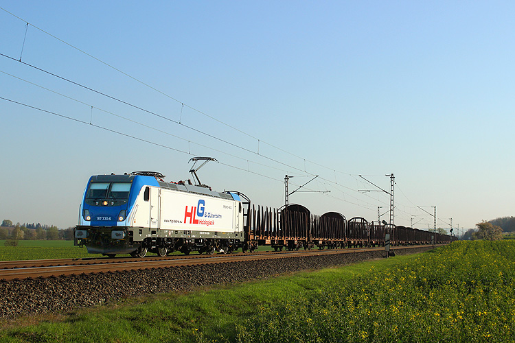 HLG 187 330 fuhr mit einem leeren Holzzug südwärts. |
