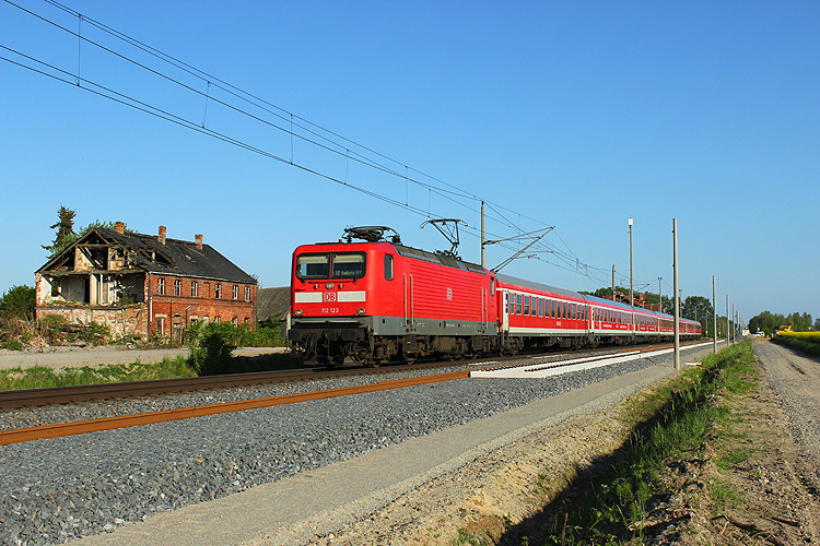 Auch bei Meßdorf lief der zweigleisige Ausbau auf Hochtouren, als ich am 15.05.2015 112 123 mit dem IRE 18092 Berlin - Hamburg dort aufnahm. Mit der Inbetriebnahme des zweiten Gleises soll allerdings auch der dortige Haltepunkt aufgegeben werden, da man kein Geld für den Bau des zweiten Bahnsteiges übrig hat. |