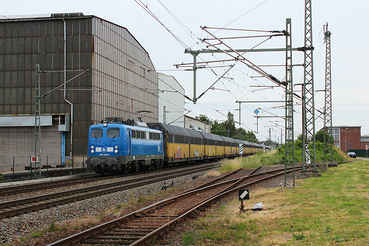 Nach dem Ende der Veranstaltung hatte ich noch etwas Zeit und nutzte diese unter anderem für ein Bild von der Press 140 008 mit dem BMW-Zug Leipzig - Bremerhaven. Das nach rechts führende Gleis ist die Zufahrt des Ausbesserungs-Werkes. |