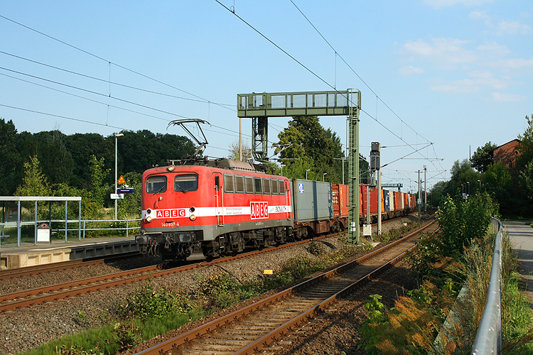 In Hohenwulsch erwischte ich am 26.07.2012 die gerade frisch für die ABEG umgestaltete 140 857 der EGP, die mit dem Containerzug Schkopau - Hamburg unterwegs war. |