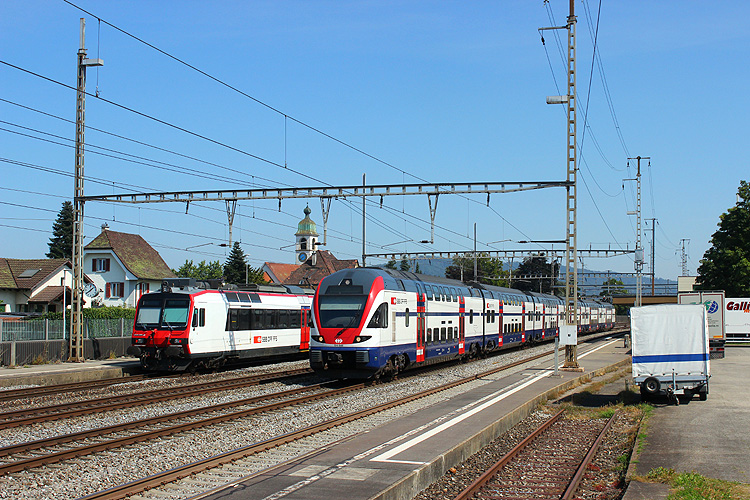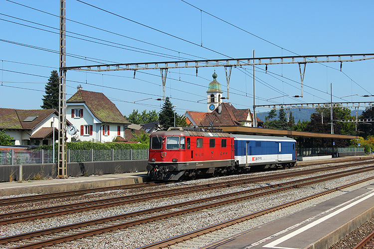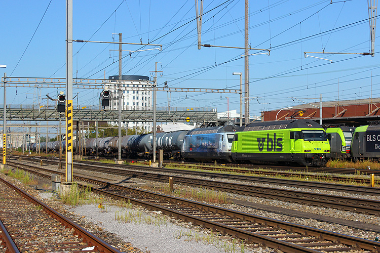 BLS 465 014+016 waren mit einem Kesselzug in Richtung Rheinfelden unterwegs. |