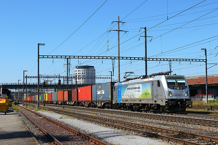 BLS 187 008 war mit einem Containerzug in Richtung Liestal unterwegs. |