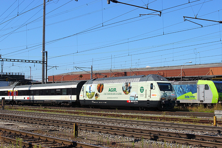 Werbelok SBB 460 041 "Agir" hing vor dem IR 1975 Basel - Zürich. |