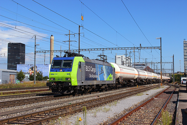 BLS 485 001 kam mit einem Gaskesselzug aus Richtung Liestal. |
