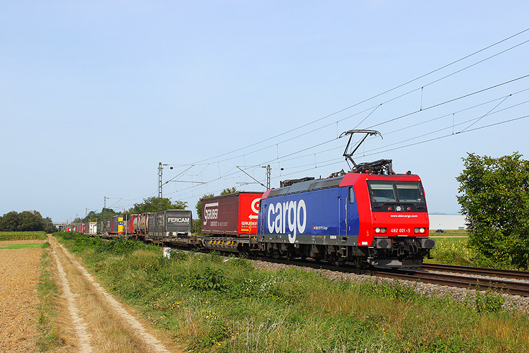 Nach einem kurzen, lichtbedingten Stellungswechsel ging es bei Buggingen weiter. SBB Cargo 482 001 fuhr mit einem KLV in Richtung Basel. |