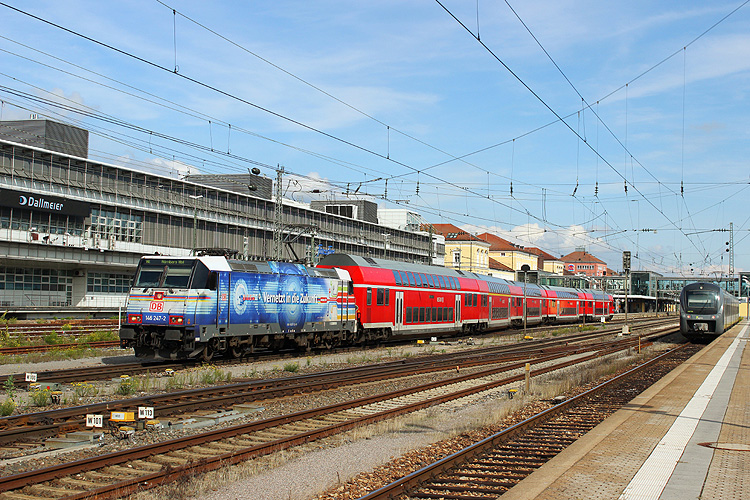 Vor dem RE 4858 München - Nürnberg hing die Werbelok 146 247 "Vernetzt in die Zukunft". |