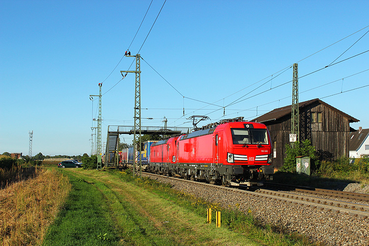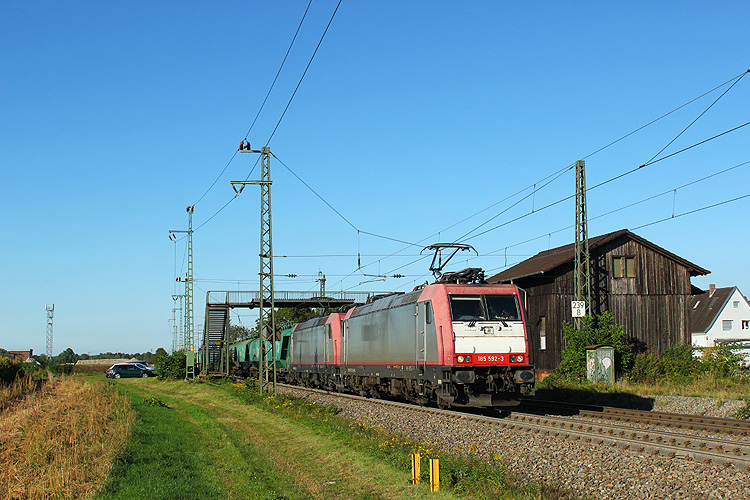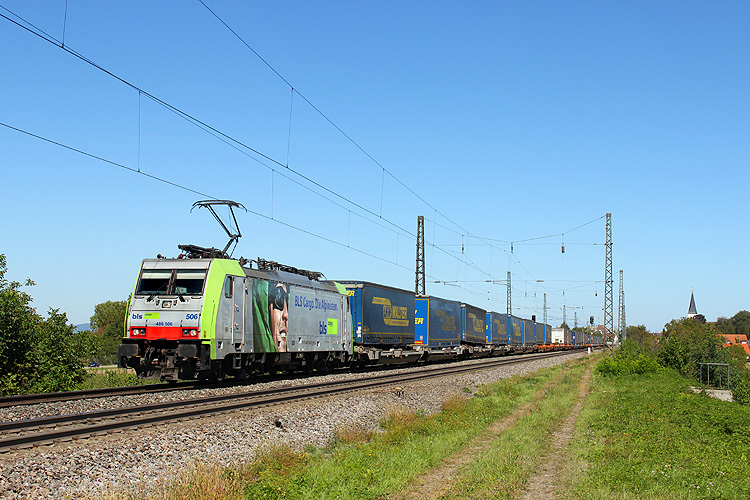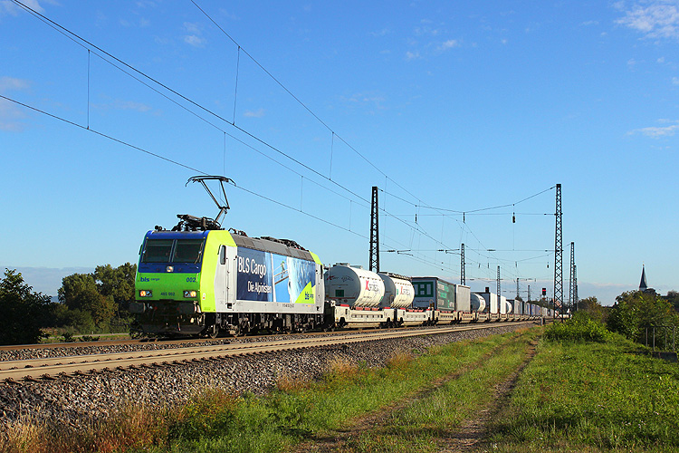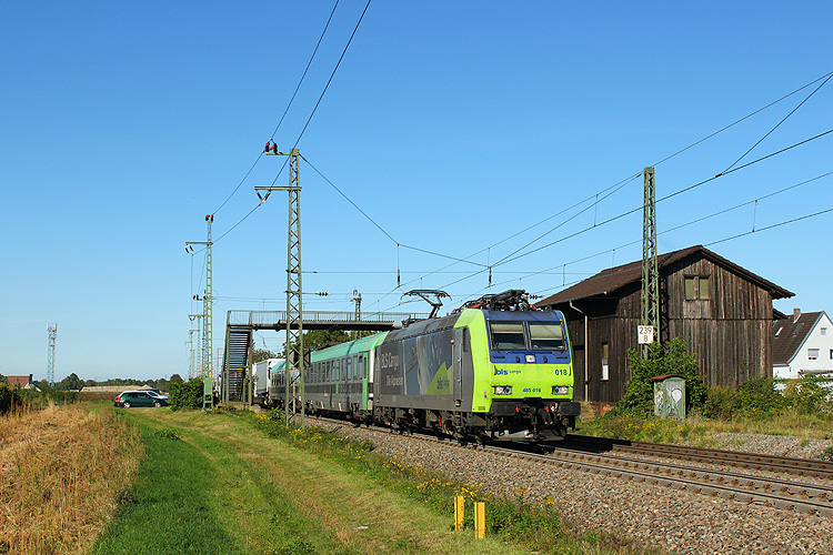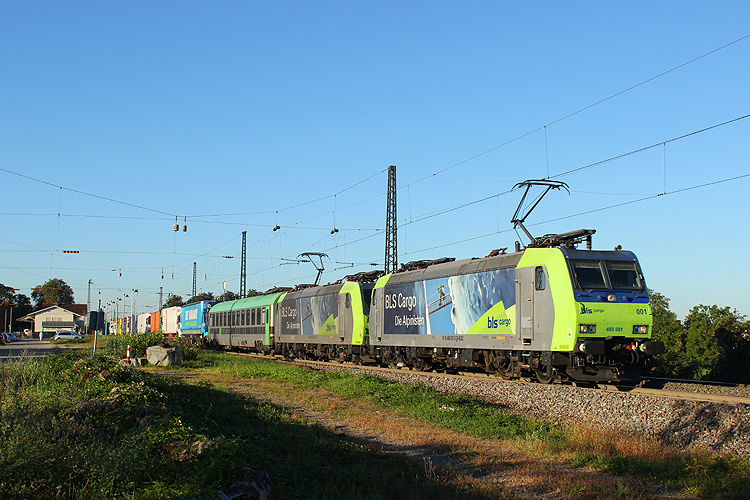 Weil es so ergiebig war, ging es am 13.09.2019 noch einmal früh morgens an die Rheintalbahn nach Heitersheim. Den Anfang machten BLS-Cargo 485 001+011 mit einem Cargo-Beamer von Novara nach Freiburg. |