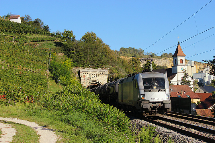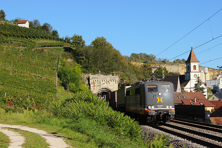 An der Tunnelausfahrt Efringen-Kirchen erwischte ich die für WRS fahrende 182 601 mit einem Kesselzug in Richtung Freiburg. |